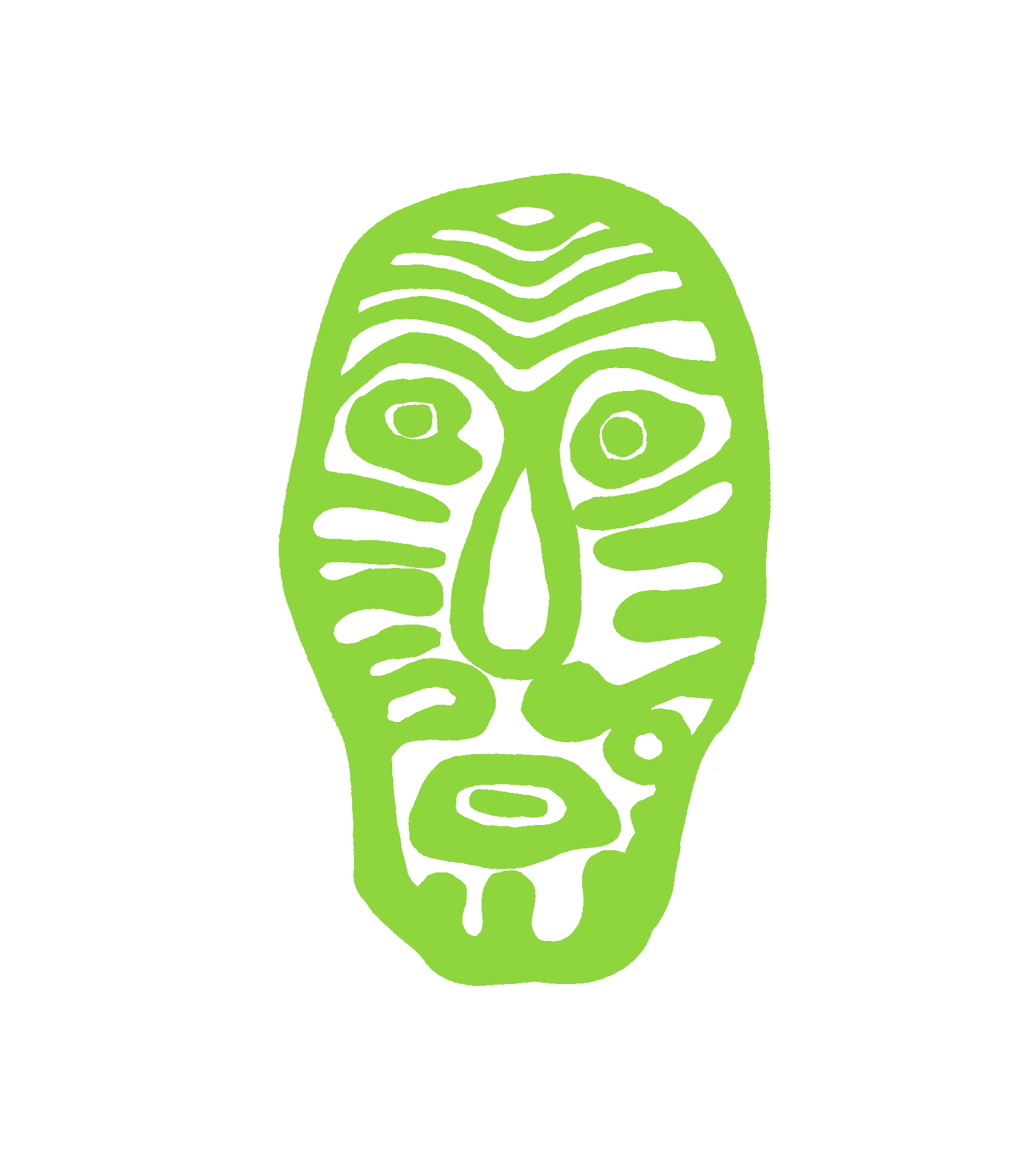 Антропоморфная личина в "боевой" тигриной раскраске наиболее часто встречается в этой группе. Вытянутые скулы и заметный нос делают её схожей с образом обезьяны.