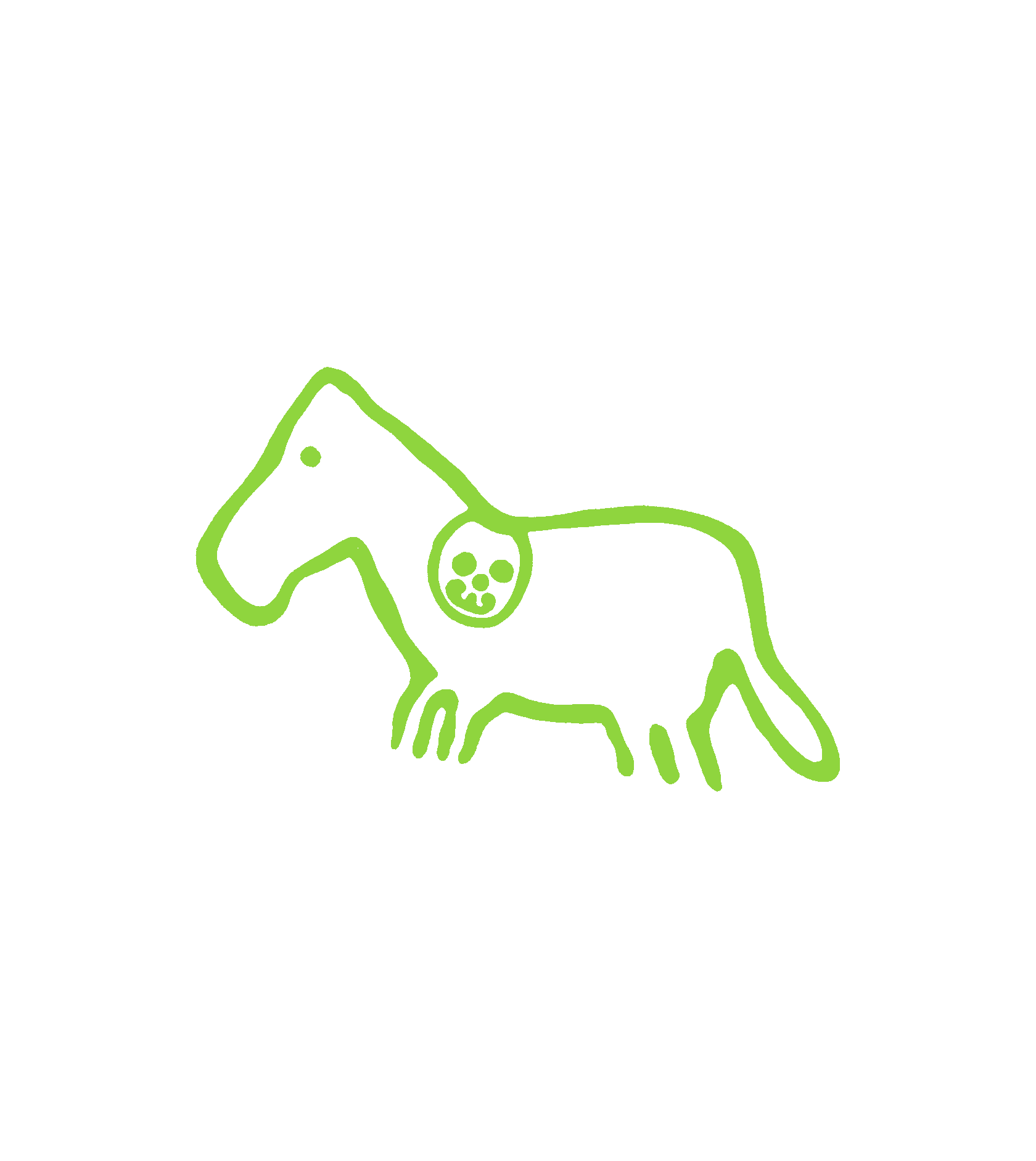 Схематичное изображение узнаваемого животного со смещёнными пропорциями — большой головой и короткими ногами, а также человеческим лицом на крупе.
